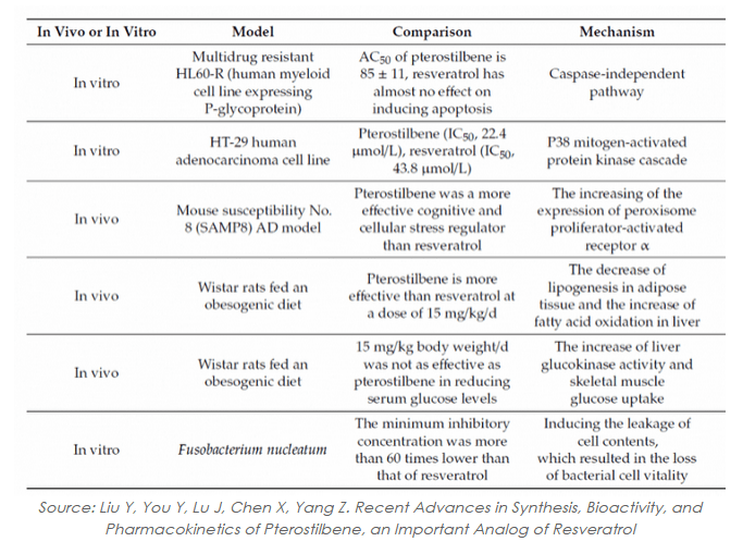 Karena karakteristik strukturalnya, pterostilbene lebih lipofilik, menunjukkan bioavailabilitas yang lebih baik, dan lebih aktif secara biologis dibandingkan resveratrol.